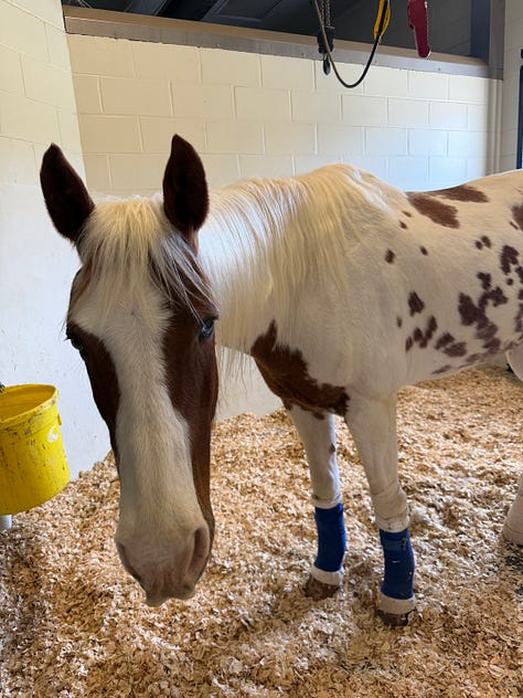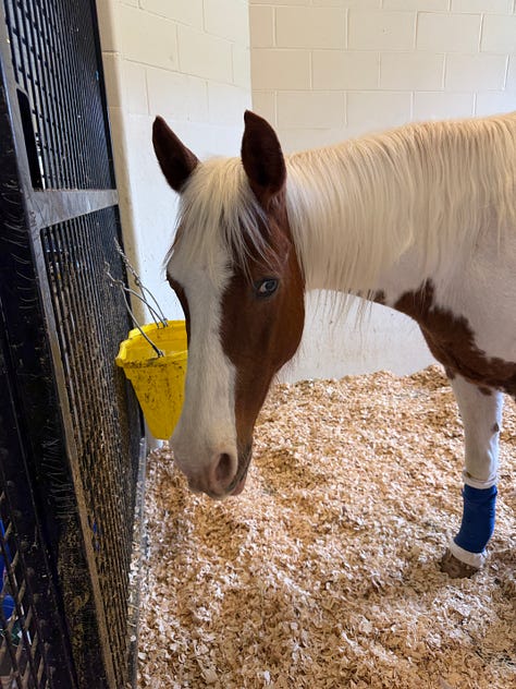 The biggest concern is that her support limb — the “good” leg — may be struggling under that load, potentially developing laminitis. She is wearing a wooden clog to help support that foot, but it also limits what we can directly evaluate.