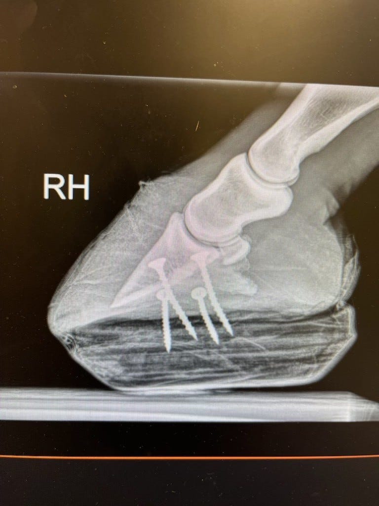 Her x-rays were - mixed. The implants on the surgery leg still appear to be in place, which is good. It's the right leg - the "good" leg - that is bearing too much weight. The coffin bone is far too close to the sole (and that is from the inside). If it breaks through under the strain of the extra weight, this is over.